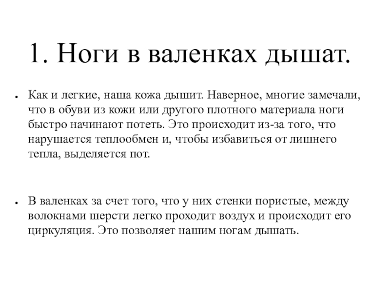 В валенках за счет того, что у них стенки пористые, между волокнами шерсти легко проходит воздух и происходит его циркуляция. Это позволяет нашим ногам дышать.