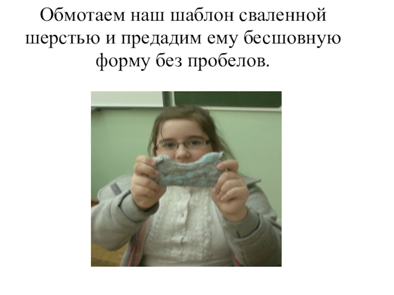 Слайд 20Обмотаем наш шаблон сваленной шерстью и предадим ему бесшовную форму без