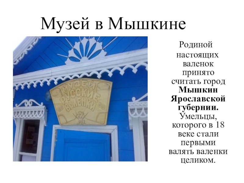 Мышкин Ярославской губернии. Умельцы, которого в 18 веке стали первыми валять валенки целиком.