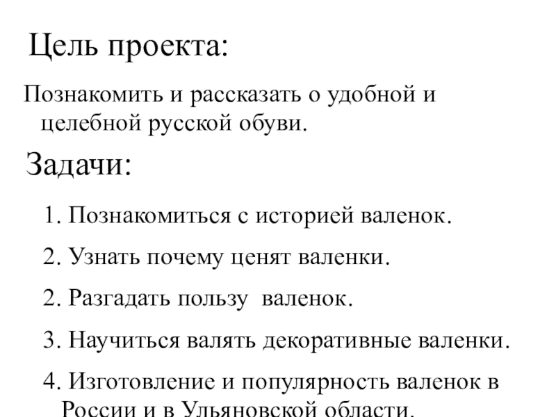 Познакомить и рассказать о удобной и целебной русской обуви.
