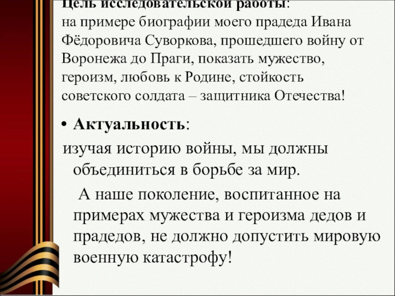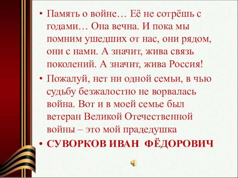 А наше поколение, воспитанное на примерах мужества и героизма дедов и прадедов, не должно допустить мировую военную катастрофу!