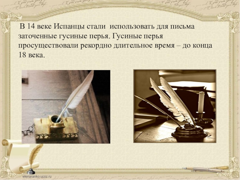Слайд 8 В 14 веке Испанцы стали использовать для письма заточенные гусиные