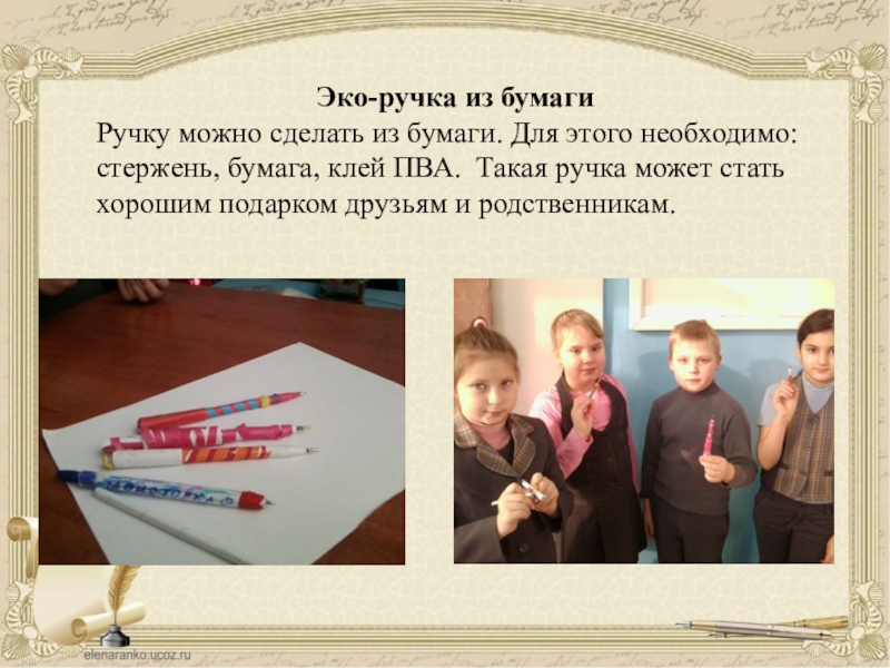Ручками можно нарисовать картину. Можно сделать эко-ручку из бумаги. Ну,