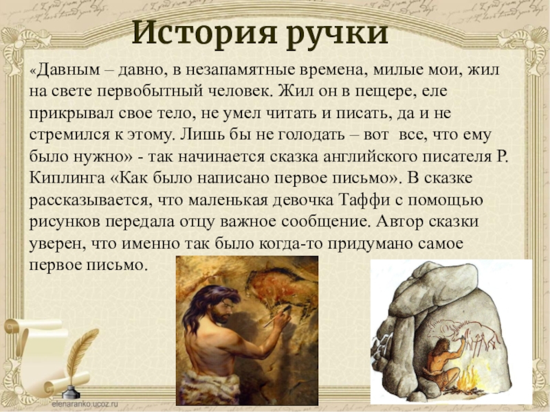 свете первобытный человек. Жил он в пещере, еле прикрывал свое тело, не умел читать и писать, да и не стремился к этому. Лишь бы не голодать – вот все, что ему было нужно» - так начинается сказка английского писателя Р.Киплинга «Как было написано первое письмо». В сказке рассказывается, что маленькая девочка Таффи с помощью рисунков передала отцу важное сообщение. Автор сказки уверен, что именно так было когда-то придумано самое первое письмо.