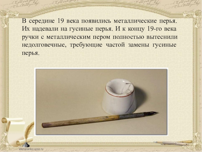Слайд 9В середине 19 века появились металлические перья. Их надевали на гусиные