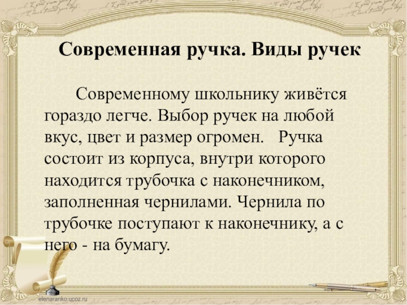 гораздо легче. Выбор ручек на любой вкус, цвет и размер огромен. Ручка состоит из корпуса, внутри которого находится трубочка с наконечником, заполненная чернилами. Чернила по трубочке поступают к наконечнику, а с него - на бумагу.