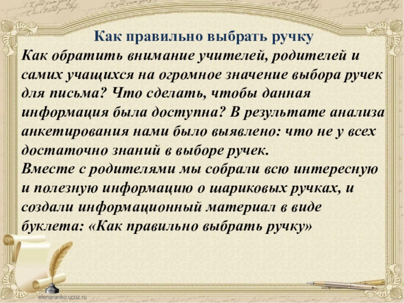 на огромное значение выбора ручек для письма? Что сделать, чтобы данная информация была доступна? В результате анализа анкетирования нами было выявлено: что не у всех достаточно знаний в выборе ручек.