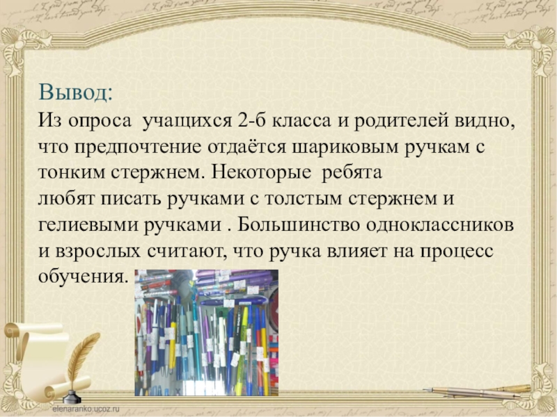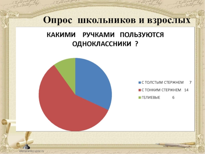 любят писать ручками с толстым стержнем и гелиевыми ручками . Большинство одноклассников и взрослых считают, что ручка влияет на процесс обучения.