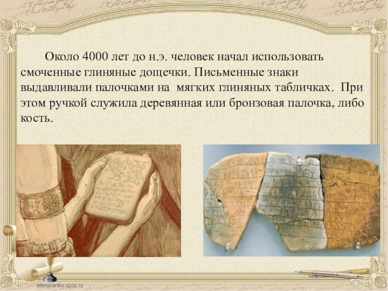 использовать смоченные глиняные дощечки. Письменные знаки выдавливали палочками на мягких глиняных табличках. При этом ручкой служила деревянная или бронзовая палочка, либо кость.