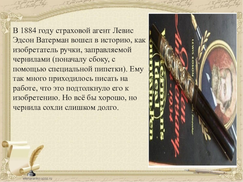 Слайд 10В 1884 году страховой агент Левис Эдсон Ватерман вошел в историю,