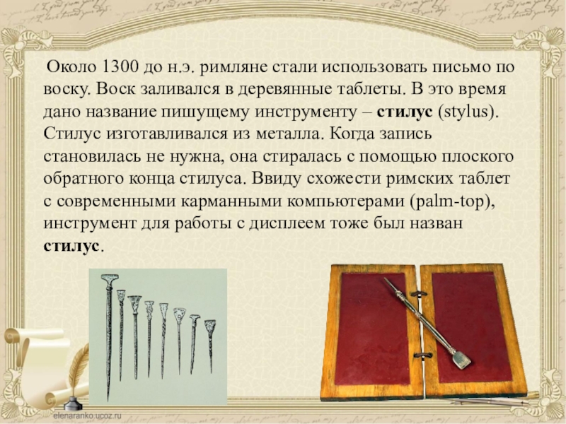 Слайд 7 Около 1300 до н.э. римляне стали использовать письмо по воску.