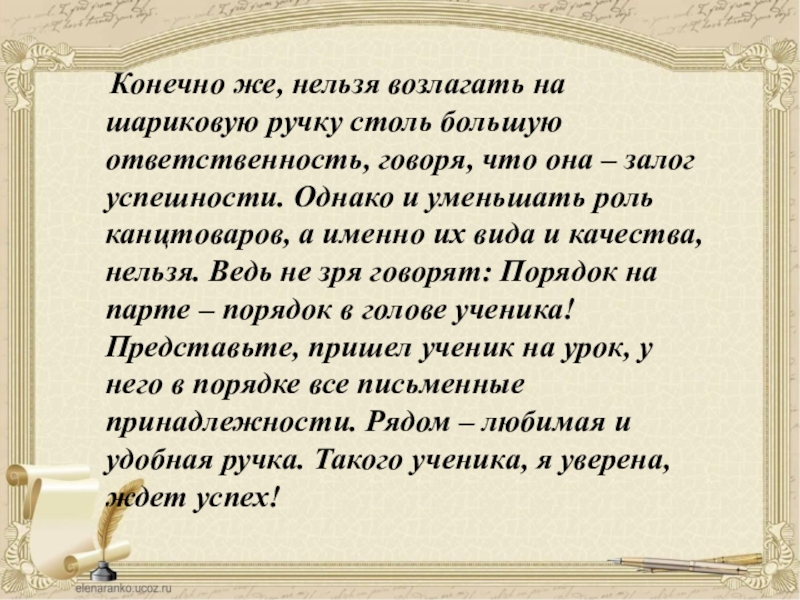 говоря, что она – залог успешности. Однако и уменьшать роль канцтоваров, а именно их вида и качества, нельзя. Ведь не зря говорят: Порядок на парте – порядок в голове ученика! Представьте, пришел ученик на урок, у него в порядке все письменные принадлежности. Рядом – любимая и удобная ручка. Такого ученика, я уверена, ждет успех!