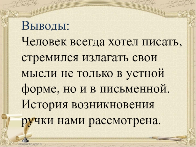 в устной форме, но и в письменной. История возникновения ручки нами рассмотрена.