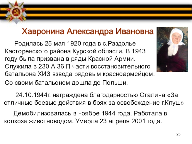 24.10.1944г. награждена благодарностью Сталина «За отличные боевые действия в боях за освобождение г.Клуш»