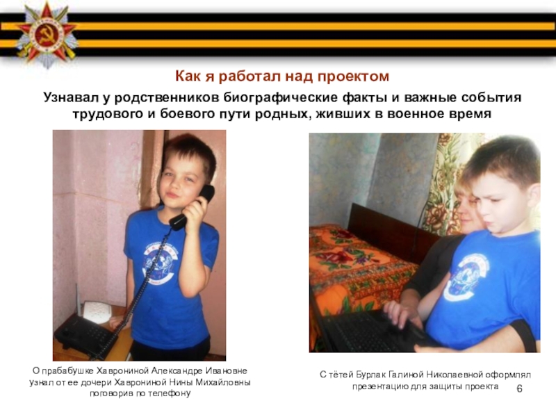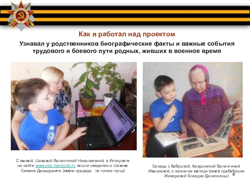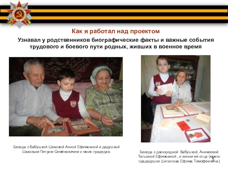 Узнавал у родственников биографические факты и важные события трудового и боевого пути родных, живших в военное время