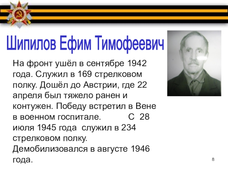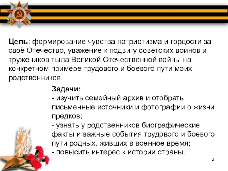 - узнать у родственников биографические факты и важные события трудового и боевого пути родных, живших в военное время;