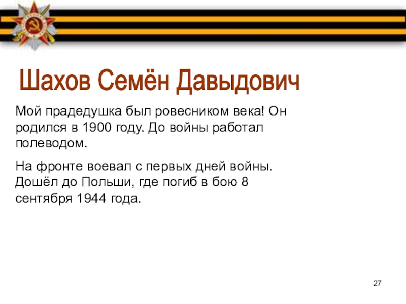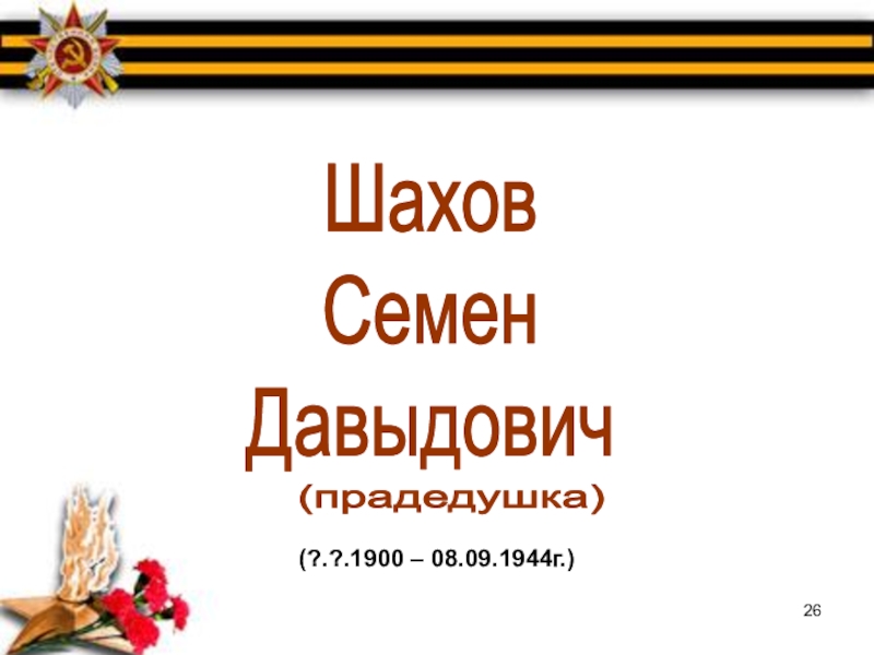 С мамой, Шаховой Валентиной Николаевной, в Интернете на сайте www.obd.memorial.ru нашли сведения о Шахове Семене Давыдовиче (моём прадеде по линии папы)