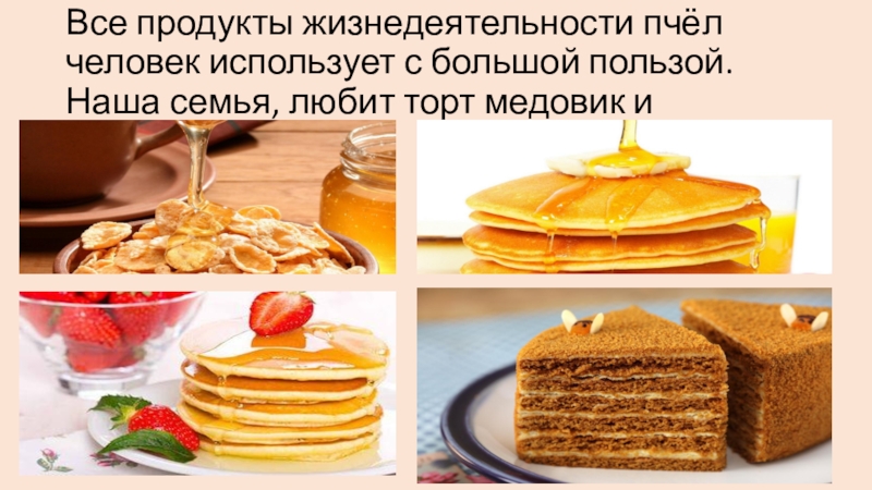Все продукты жизнедеятельности пчёл человек использует с большой пользой. Наша семья, любит торт медовик и блинчики с