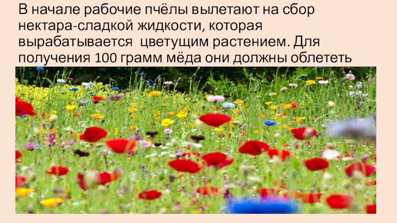 Слайд 4В начале рабочие пчёлы вылетают на сбор нектара-сладкой жидкости, которая вырабатывается