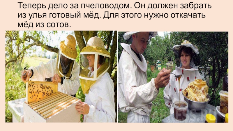 Слайд 9Теперь дело за пчеловодом. Он должен забрать из улья готовый мёд.