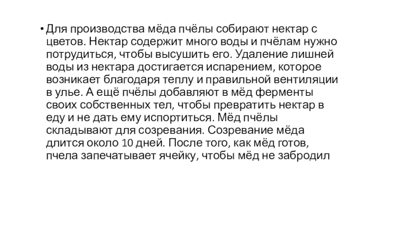 воды и пчёлам нужно потрудиться, чтобы высушить его. Удаление лишней воды из нектара достигается испарением, которое возникает благодаря теплу и правильной вентиляции в улье. А ещё пчёлы добавляют в мёд ферменты своих собственных тел, чтобы превратить нектар в еду и не дать ему испортиться. Мёд пчёлы складывают для созревания. Созревание мёда длится около 10 дней. После того, как мёд готов, пчела запечатывает ячейку, чтобы мёд не забродил