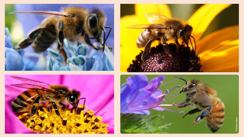 Слайд 5Пчёлы собирают нектар с цветов с помощью хоботка, засасывая его язычком
