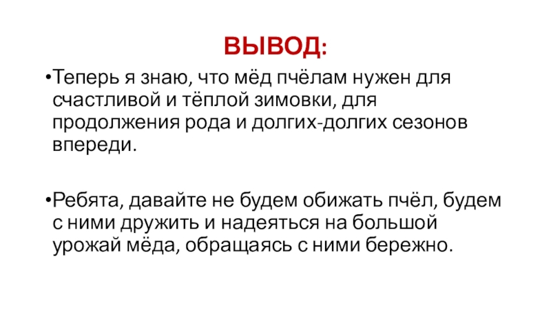 ВЫВОД:Теперь я знаю, что мёд пчёлам нужен для счастливой и тёплой зимовки, для продолжения рода и долгих-долгих