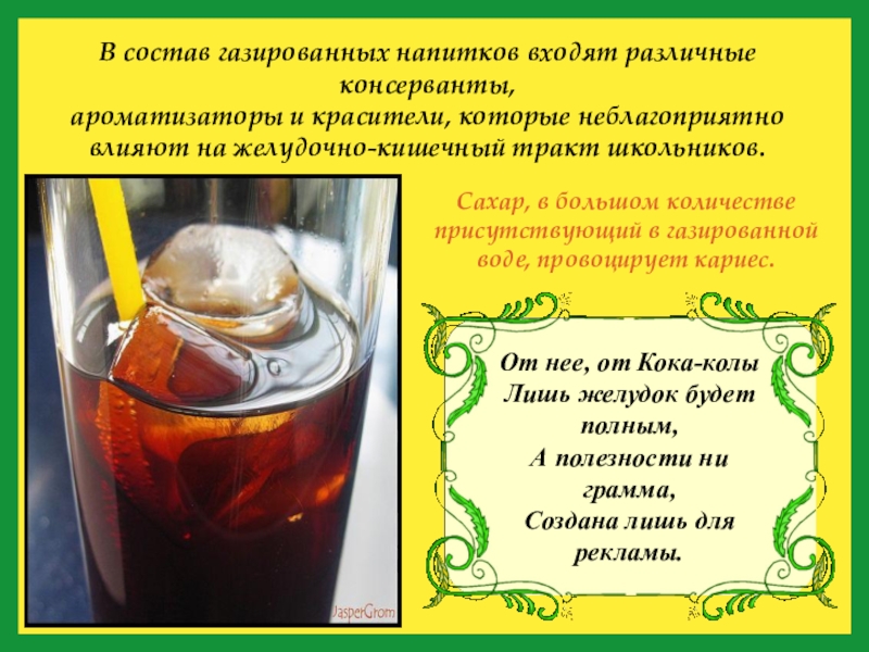Сахар, в большом количестве присутствующий в газированной воде, провоцирует кариес.