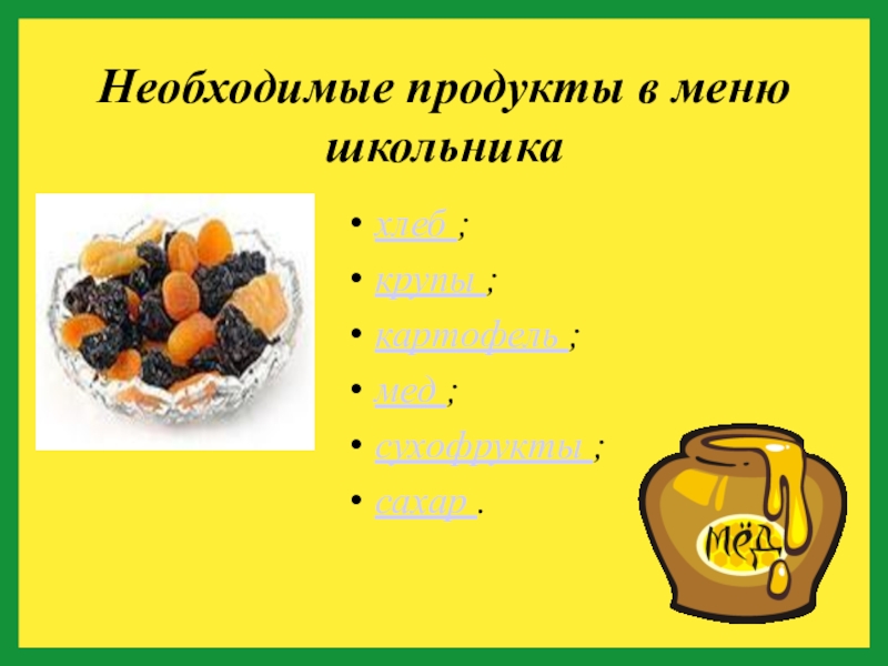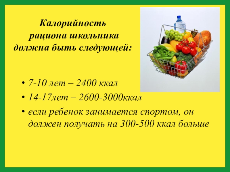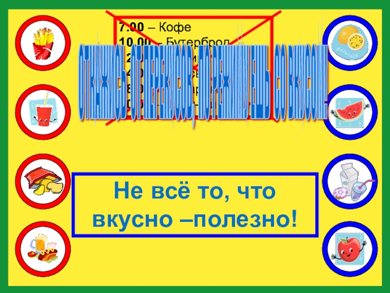 7.00 – Кофе 10.00 – Бутерброд 12.00 - Доширак 14.00 – Чипсы, Кола 18.00 – Сухарики 20.00 - Плотный ужин.