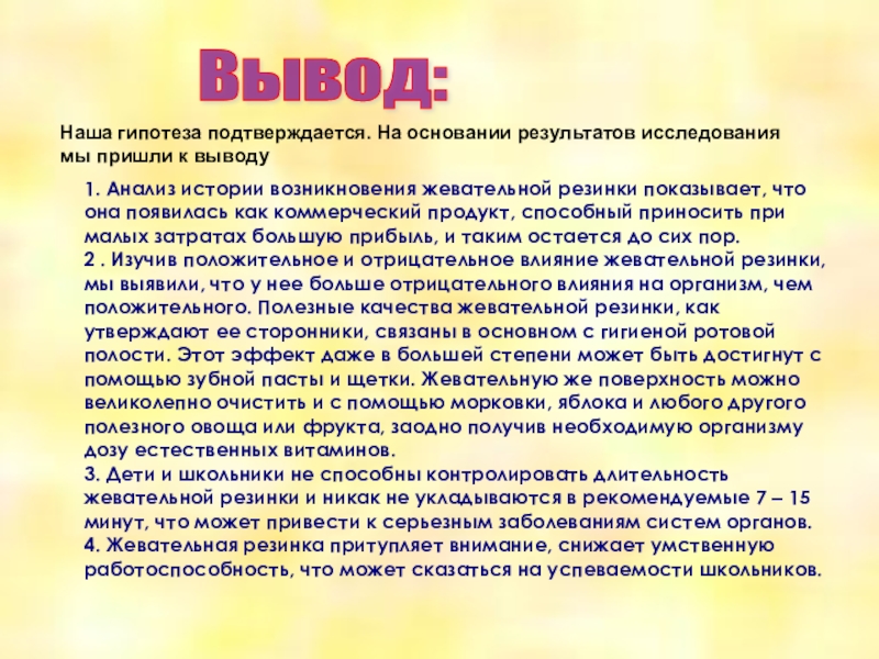 2 . Изучив положительное и отрицательное влияние жевательной резинки, мы выявили, что у нее больше отрицательного влияния на организм, чем положительного. Полезные качества жевательной резинки, как утверждают ее сторонники, связаны в основном с гигиеной ротовой полости. Этот эффект даже в большей степени может быть достигнут с помощью зубной пасты и щетки. Жевательную же поверхность можно великолепно очистить и с помощью морковки, яблока и любого другого полезного овоща или фрукта, заодно получив необходимую организму дозу естественных витаминов.