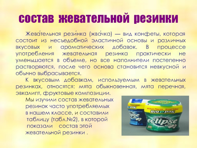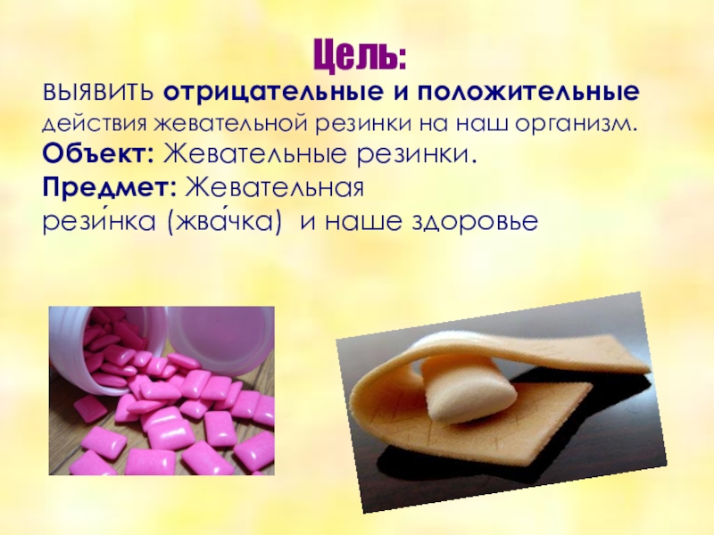 жуют на занятиях, жуют дома, жуют на работе, жуют за рулём автомобиля. Ежедневно по телевидению мы наблюдаем уйму реклам жевательных резинок, нас постоянно убеждают использовать жевательную резинку, которая не только освежает дыхание, но и укрепляет зубы. Однако большинство врачей специалистов говорят, что жевательная резинка вредна. От взрослых мы часто слышим: « Выплюни жвачку!», «Перестань жевать!», «Жвачка вредит твоему желудку!» А в телерекламе говорят о пользе, предлагают разные сорта жевательной резинки. У нас возникли вопросы: «так ли полезна жевательная резинка, как нам это представляют в рекламе?» «И чего же действительно больше в жевательной резинке, вреда или пользы?»
