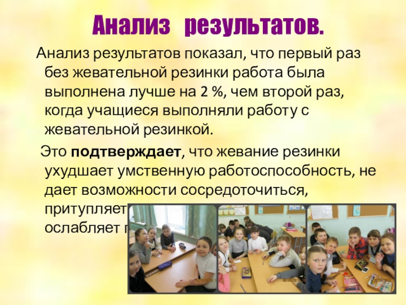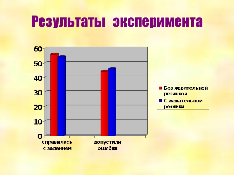 показал, что первый раз без жевательной резинки работа была выполнена лучше на 2 %, чем второй раз, когда учащиеся выполняли работу с жевательной резинкой.