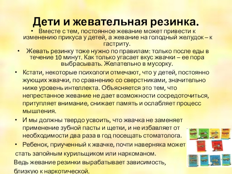 Кстати, некоторые психологи отмечают, что у детей, постоянно жующих жвачки, по сравнению со сверстниками, значительно ниже уровень интеллекта. Объясняется это тем, что непрестанное жевание не дает возможности сосредоточиться, притупляет внимание, снижает память и ослабляет процесс мышления.
