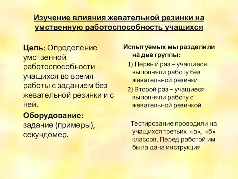 умственную работоспособность учащихся и влияние на её показатели жевания жевательной резинки.