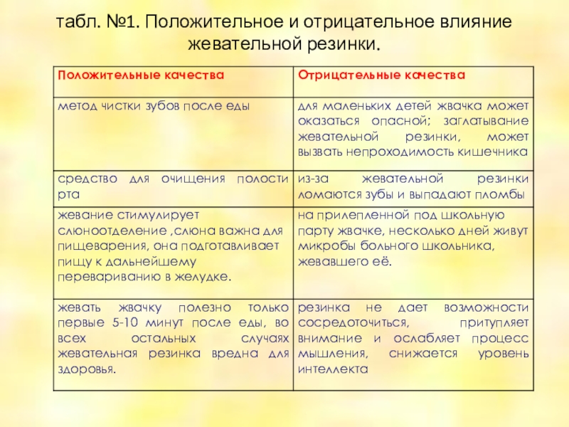 Слайд 12табл. №1. Положительное и отрицательное влияние жевательной резинки.