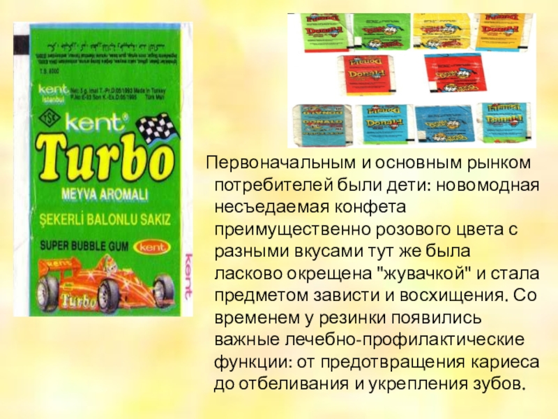 Слайд 10 Первоначальным и основным рынком потребителей были дети: новомодная несъедаемая