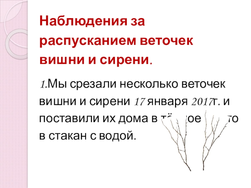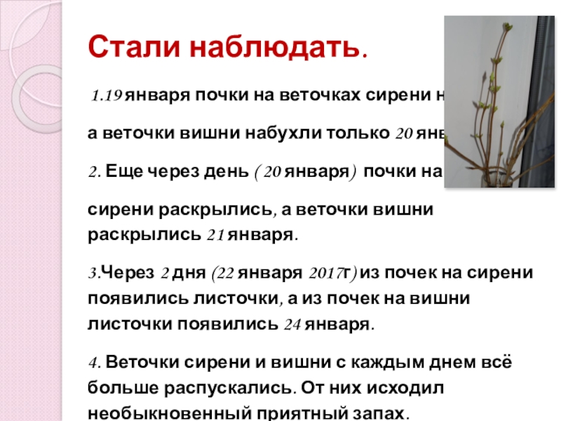 Слайд 8Наблюдения за распусканием веточек вишни и сирени.