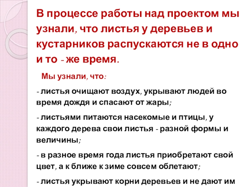 Слайд 11В процессе работы над проектом мы узнали, что листья у деревьев