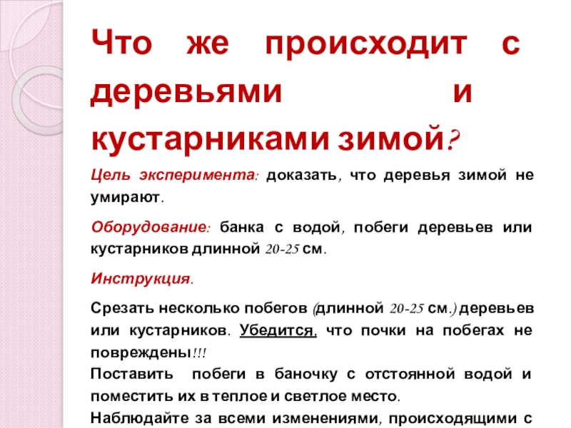Оборудование: банка с водой, побеги деревьев или кустарников длинной 20-25 см.
