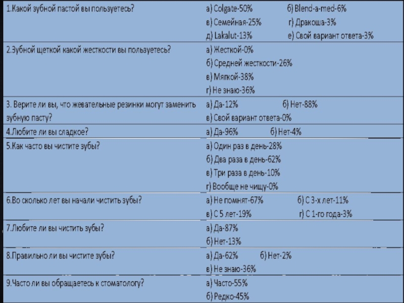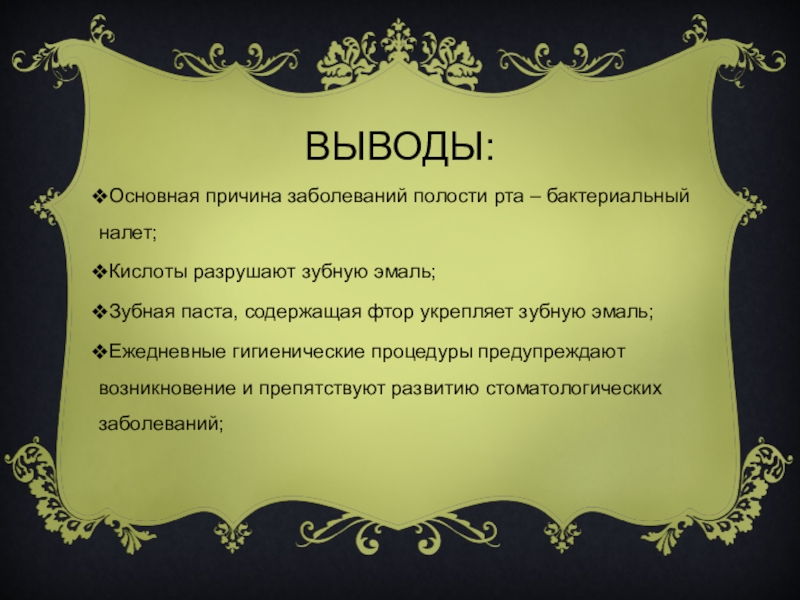 ВЫВОДЫ:Основная причина заболеваний полости рта – бактериальный налет;Кислоты разрушают зубную эмаль;Зубная паста, содержащая фтор укрепляет зубную эмаль;Ежедневные