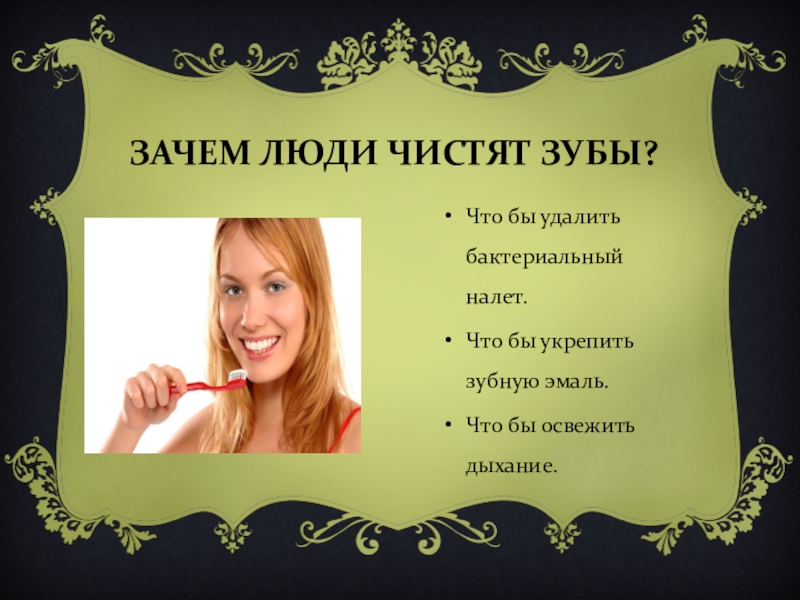 Слайд 12ЗАЧЕМ ЛЮДИ ЧИСТЯТ ЗУБЫ?