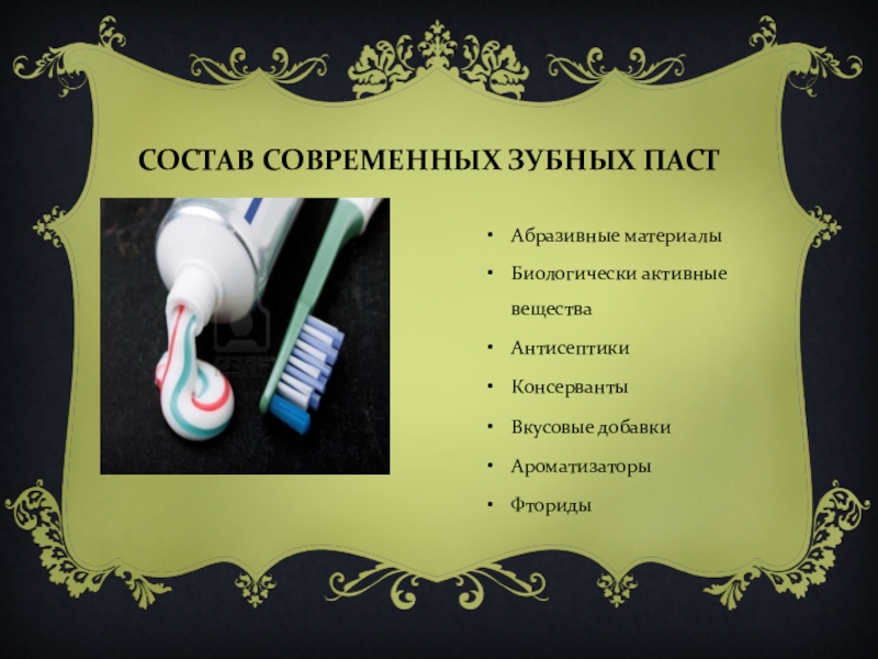 СОСТАВ СОВРЕМЕННЫХ ЗУБНЫХ ПАСТАбразивные материалыБиологически активные веществаАнтисептикиКонсервантыВкусовые добавкиАроматизаторыФториды