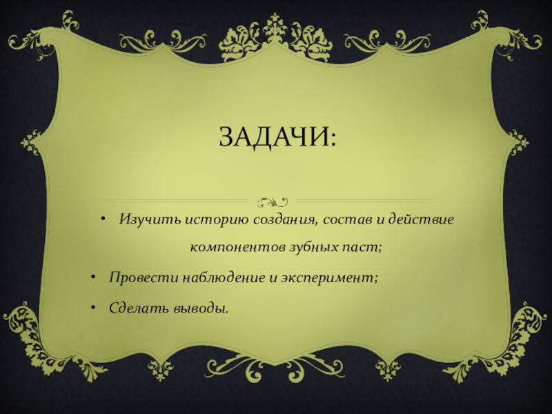 ЗАДАЧИ:Изучить историю создания, состав и действие компонентов зубных паст;Провести наблюдение и эксперимент;Сделать выводы.