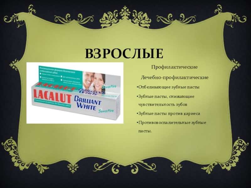 ВЗРОСЛЫЕПрофилактическиеЛечебно-профилактическиеОтбеливающие зубные пастыЗубные пасты, снижающие чувствительность зубовЗубные пасты против кариесаПротивовоспалительные зубные пасты.