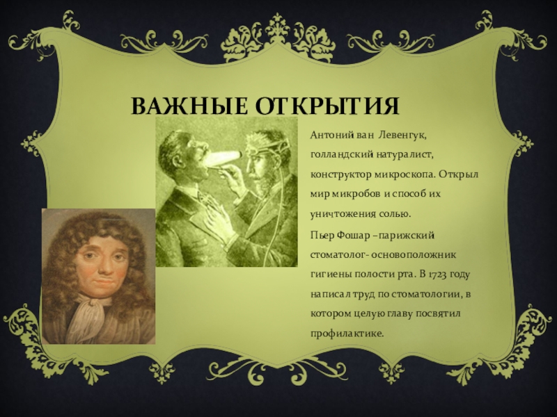ВАЖНЫЕ ОТКРЫТИЯАнтоний ван Левенгук, голландский натуралист, конструктор микроскопа. Открыл мир микробов и способ их уничтожения солью.Пьер Фошар