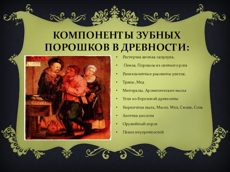 Слайд 11КОМПОНЕНТЫ ЗУБНЫХ ПОРОШКОВ В ДРЕВНОСТИ: