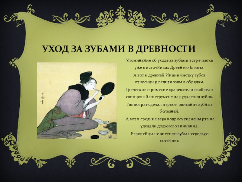 Слайд 8УХОД ЗА ЗУБАМИ В ДРЕВНОСТИ