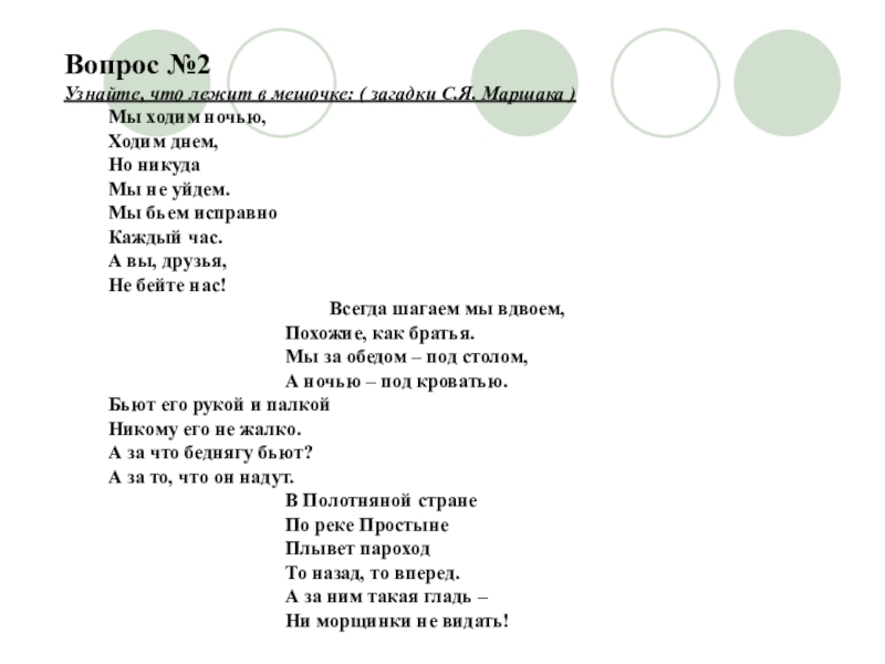 Узнайте, что лежит в мешочке: ( загадки С.Я. Маршака )