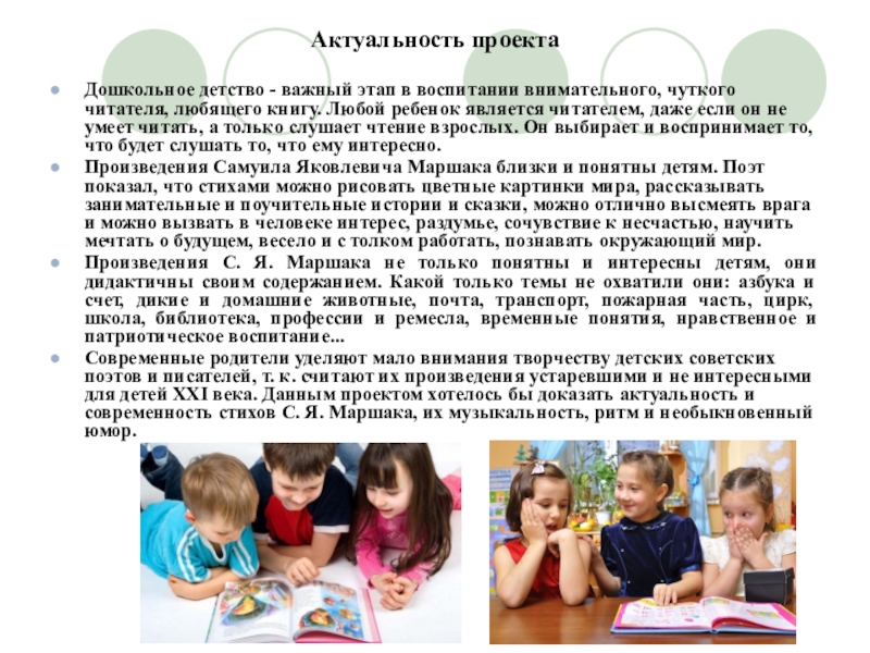 Современные родители уделяют мало внимания творчеству детских советских поэтов и писателей, т. к. считают их произведения устаревшими и не интересными для детей XXI века. Данным проектом хотелось бы доказать актуальность и современность стихов С. Я. Маршака, их музыкальность, ритм и необыкновенный юмор.