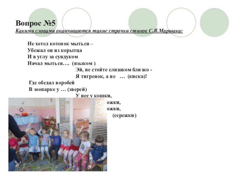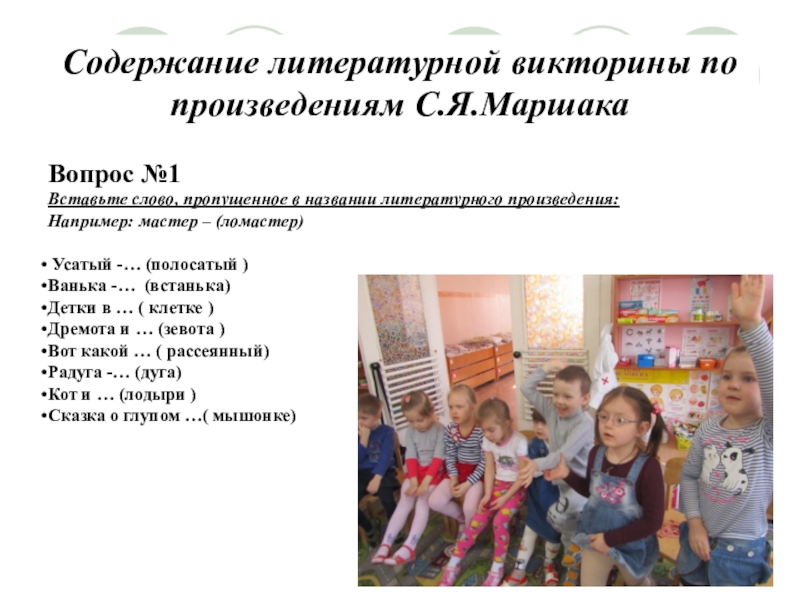 Слайд 26Содержание литературной викторины по произведениям С.Я.Маршака